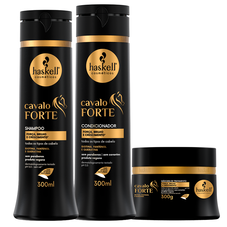 La línea Cavalo Forte fue desarrollada para fortalecer y favorecer el crecimiento del cabello. Su fórmula concentrada contiene biotina, pantenol y queratina, ingredientes activos que, juntos, promueven un tratamiento de alto rendimiento que reduce el riesgo de rotura, reconstruye y refuerza la estructura interna del cabello.